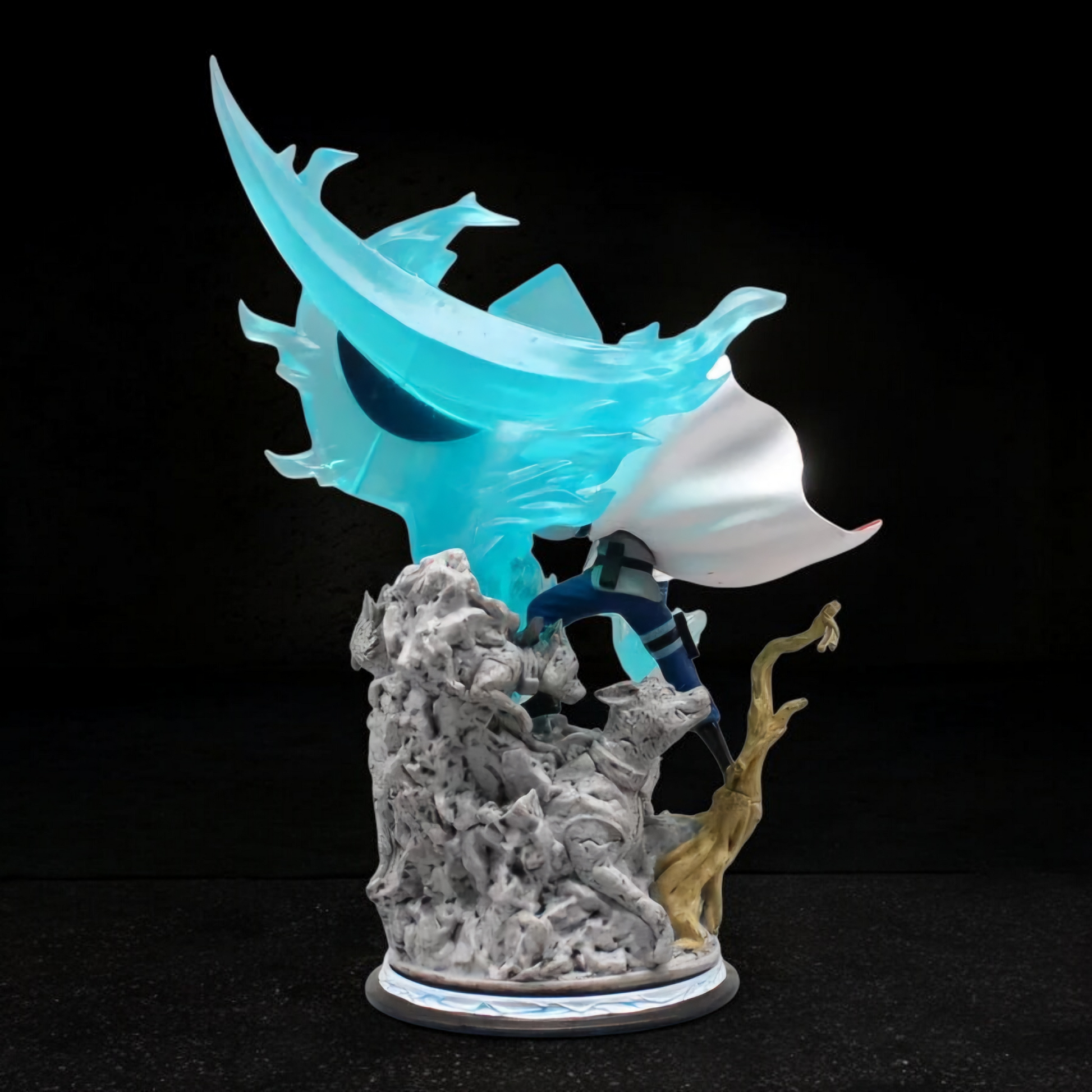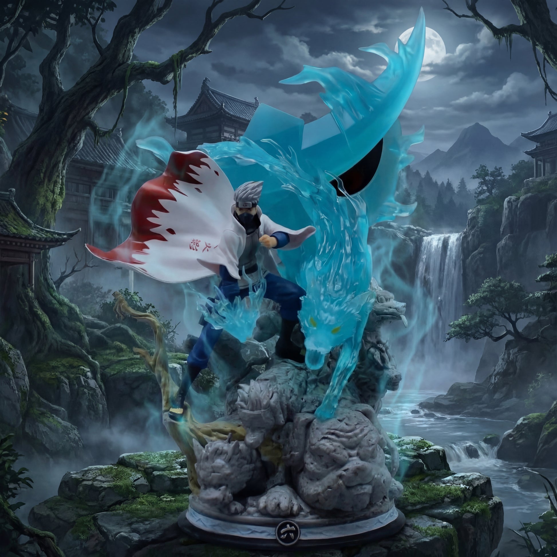 Kakashi is sculpted in a dynamic combat stance atop a rugged rocky base, surrounded by a massive translucent blue water dragon effect that symbolizes his chakra mastery. His flowing Hokage cloak, detailed ninja outfit, and focused expression bring the scene to life with intense motion and realism. The swirling water effects add depth, scale, and visual impact, making this figure a true display centerpiece.