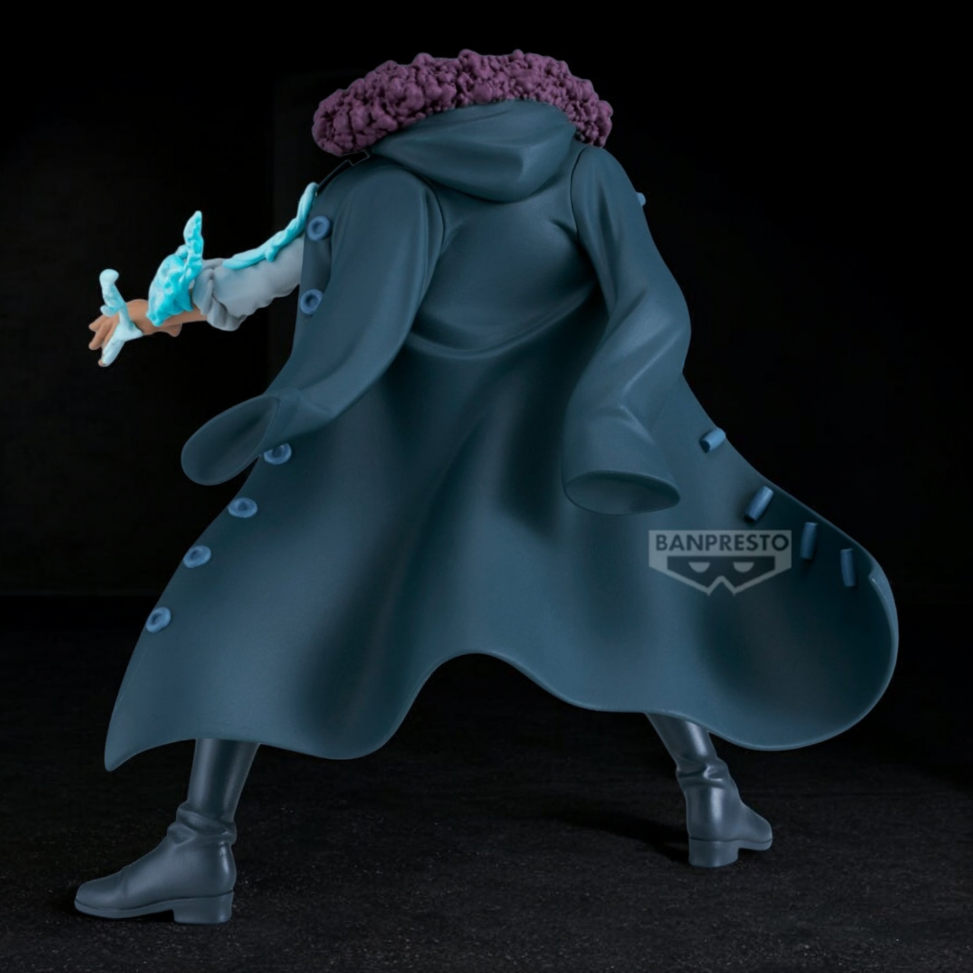 The sculpt showcases Kuzan in a wide combat stance, with translucent blue ice effects forming around both hands, symbolizing the overwhelming power of his Hie Hie no Mi. His calm yet intimidating expression, signature cap, sunglasses, and flowing Marine coat are faithfully recreated with excellent attention to detail.