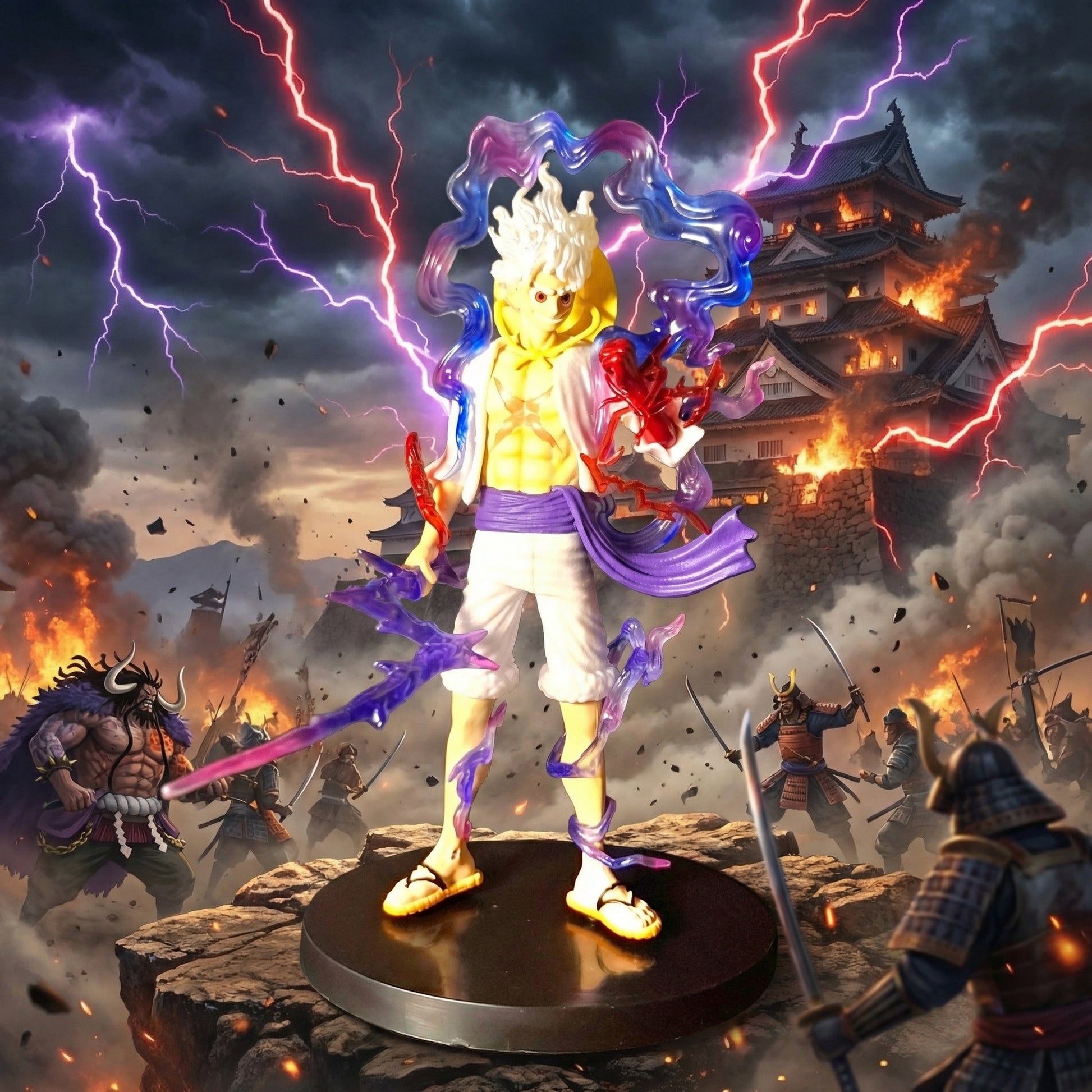 The sculpt highlights Luffy’s signature white hair, open jacket design, muscular definition, and vibrant energy detailing wrapping around the body and weapon effects. The translucent purple and blue aura elements give the figure a dramatic visual punch, making it stand out instantly on any shelf.