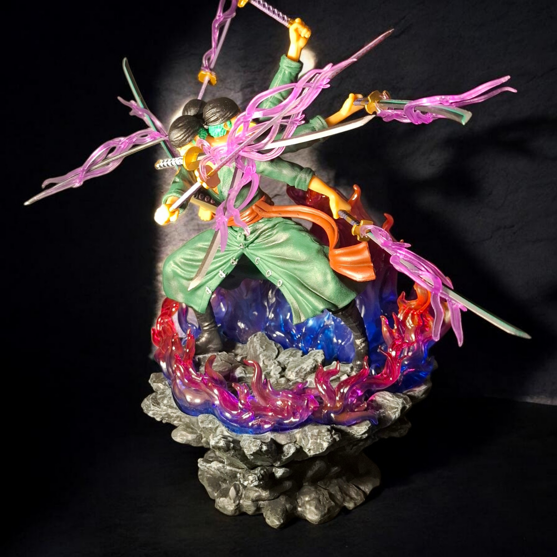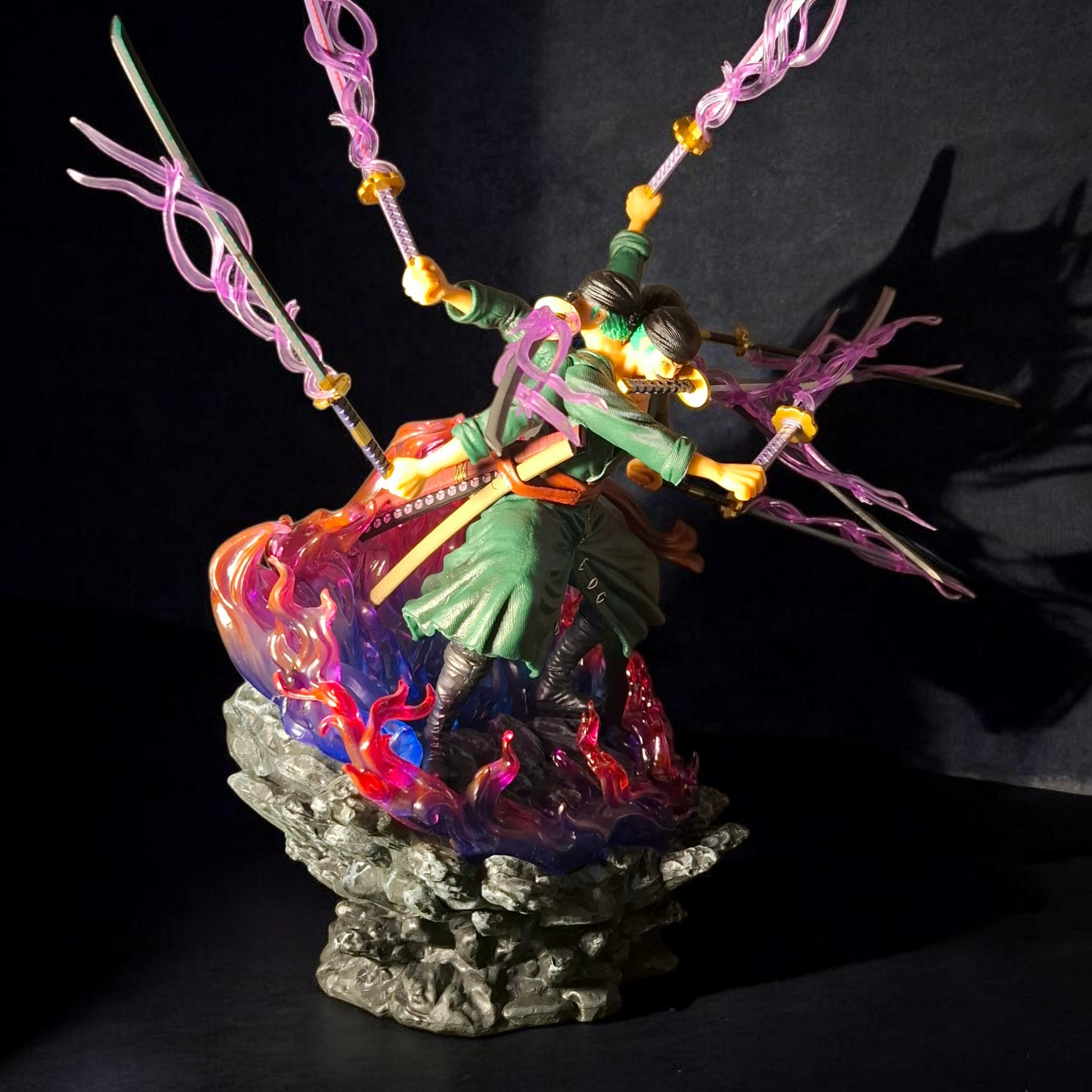 This large-scale collectible features aggressive translucent purple slash effects, fiery energy detailing at the base, and a grounded combat stance that perfectly captures Zoro’s overwhelming aura. The sculpt emphasizes raw muscle definition, layered clothing textures, and high-intensity motion effects, making it a true centerpiece for any anime display.