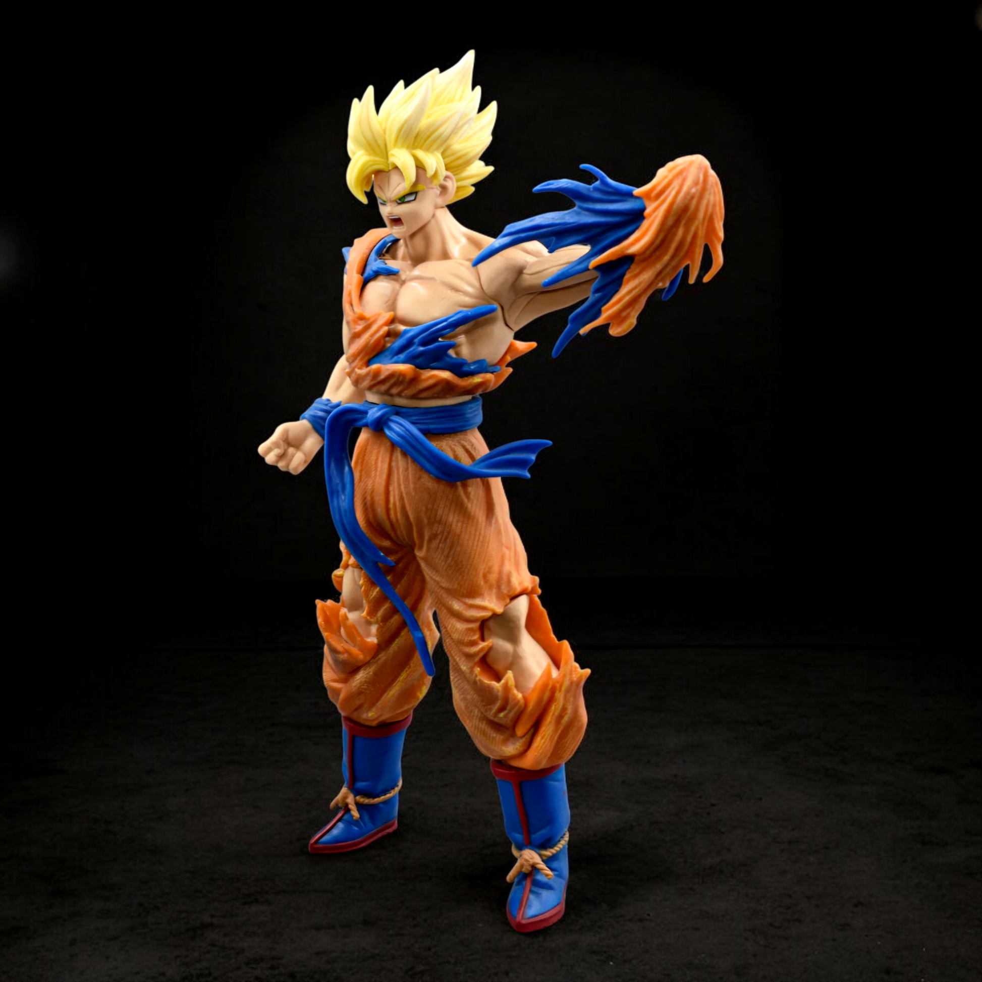 Standing an impressive 35 cm tall, Goku is sculpted with explosive musculature, golden Super Saiyan hair, and a torn orange gi that reveals the brutality of battle. The shredded fabric effects around his chest, arm, and legs create a dramatic visual impact, while the flowing blue belt and wristbands add motion and realism.