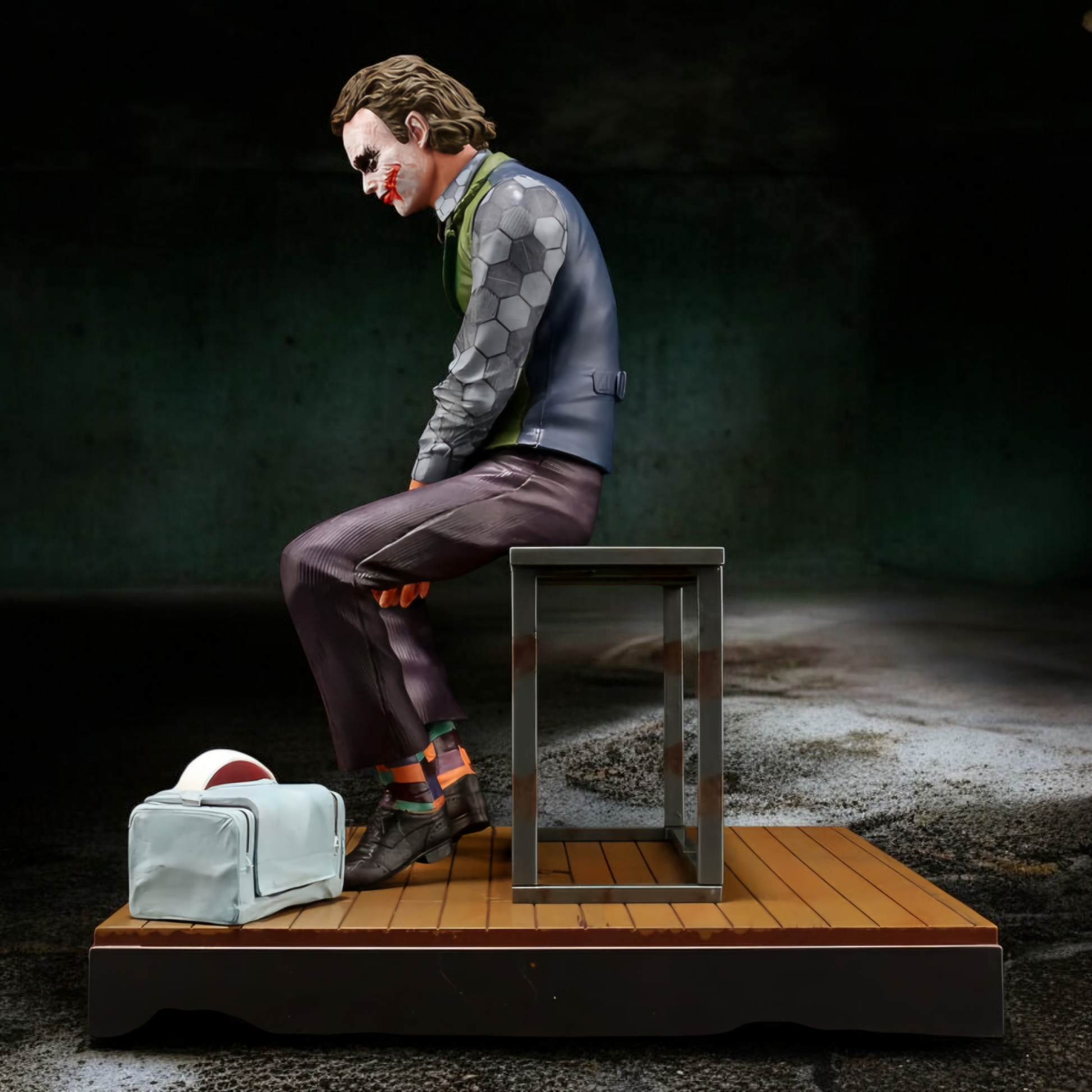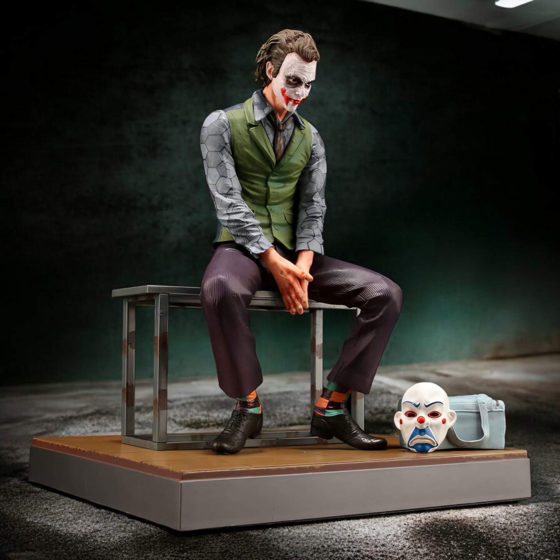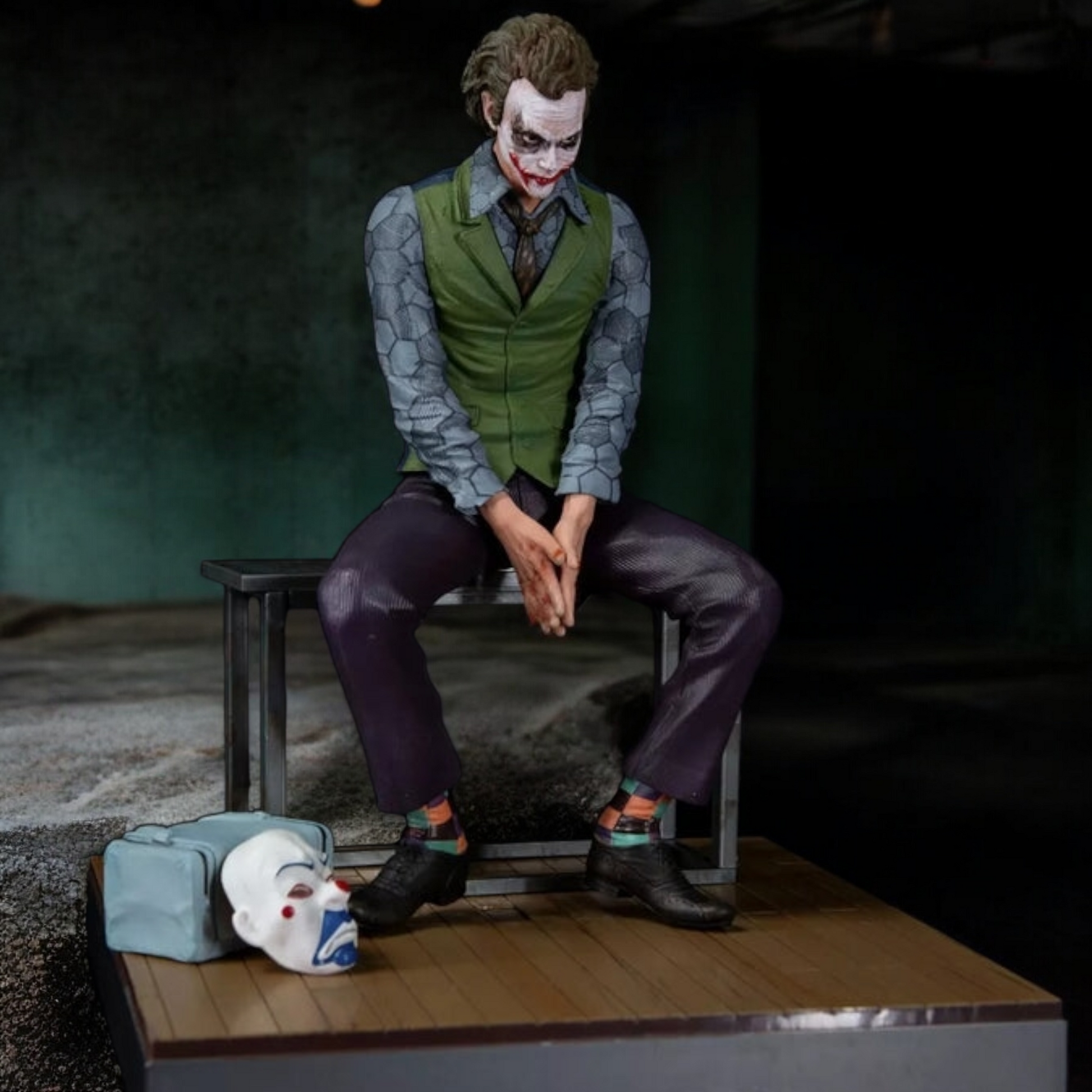 The sculpt portrays the Joker seated forward with hands clasped, head slightly tilted, and a disturbing half-smile that radiates menace. His wrinkled shirt sleeves, green vest, loosened tie, and worn trousers reflect his chaotic lifestyle, while the smeared face paint and piercing eyes deliver cinematic realism. Beside him lies his discarded clown mask and bag, symbolizing the layers between performance and true madness.
