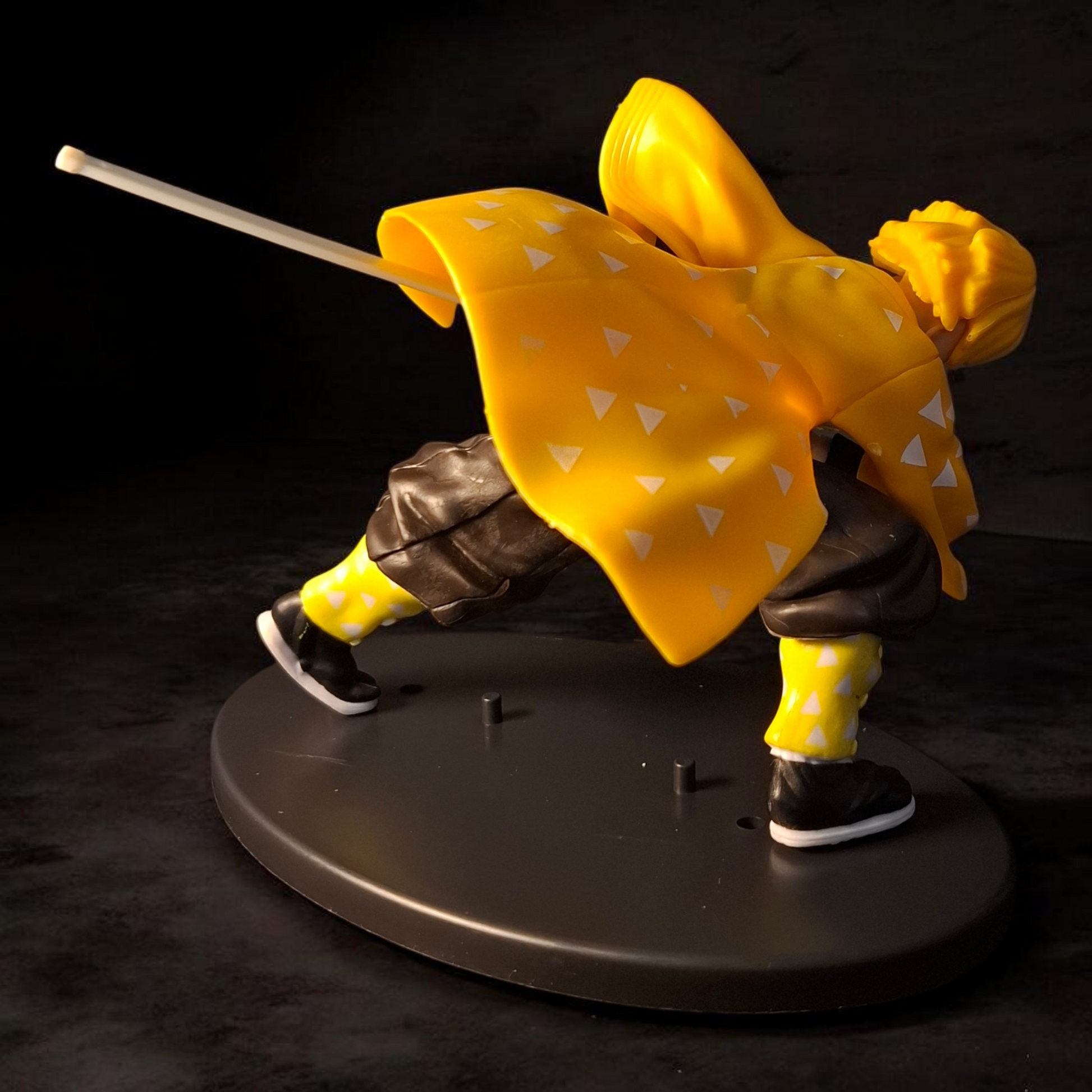 The sculpt perfectly conveys motion—Zenitsu’s bent posture, flowing haori, and focused expression bring the sense of instantaneous attack to life. The yellow haori with white triangle patterns is cleanly painted, while the sword placement and dynamic balance make this figure feel fast, sharp, and aggressive even while standing still.